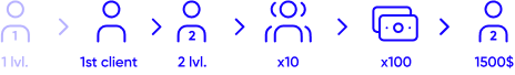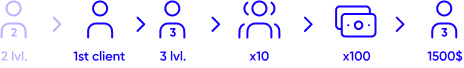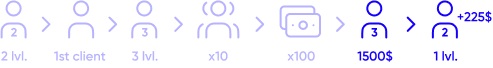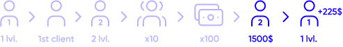 ລູກຄ້າທໍາອິດຂອງພວກເຂົາກາຍມາເປັນພາດເນີ (ລະດັບ 2) ແລະແນະນຳລູກຄ້າອີກ 10 ຄົນ. ລູກຄ້າເຫຼົ່ານີ້ຮ່ວມກັນວາງ 100 ລັອດ. ຕາມເງື່ອນໄຂຂອງໂປຣແກຣມຜົນຕອບແທນພາດເນີ ລະດັບ 2, ພາດເນີ ຈະໄດ້ຮັບ 15$ ຕໍ່ລັອດ.